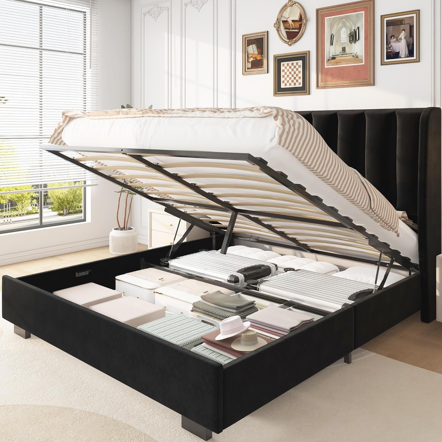 Transform your bedroom into a sanctuary with the 51″ Tall Headboard Lift Up Bed Frame. Featuring a striking velvet wingback design in black, this queen-size bed frame adds a touch of sophistication and elegance to any space. Its tall headboard ensures a luxurious look, making it the centerpiece of your room.